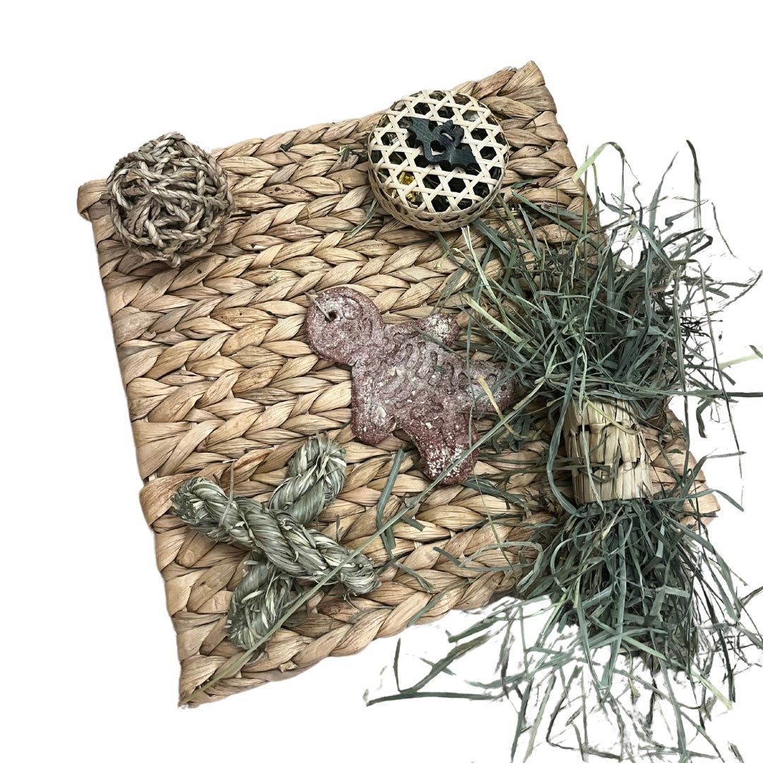 Measuring 12"x12" and crafted from natural water hyacinth, this enchanting mat is full of interactive fun. It features a bamboo foraging box to stimulate your rabbit's curiosity, a seagrass ball for rolling and chewing, nutritious timothy hay twists, and a spooky ChewyChewUK gingerbread for a tasty challenge. The palm tube filled with premium soft timothy hay adds an extra layer of engaging fun and enrichment.