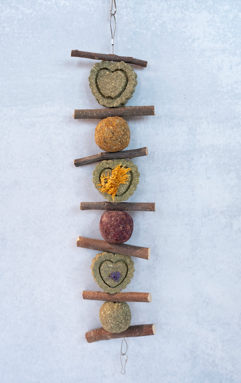 This eye-catching hanging toy features a delightful mix of compressed hay shapes, colorful forage-infused bites, and natural wood sticks. Each layer offers a new texture and taste, encouraging your bunny to nibble, tug, and explore while supporting natural chewing instincts.
